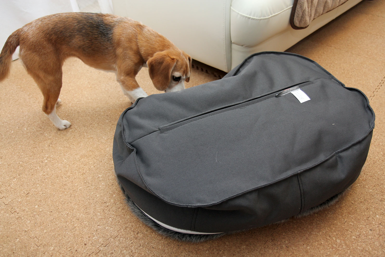 犬好きであることをターゲティングされて、Facebookの広告でやたら出てくるアンビエントラウンジ[ambientlounge.co.jp]の犬用ベッド「ペットラウンジ」です。このサイズで25,000円(!)と、けっこうな値段するんですが、デザインが気に入ってしまいつい購入。優秀だなFacebook広告。