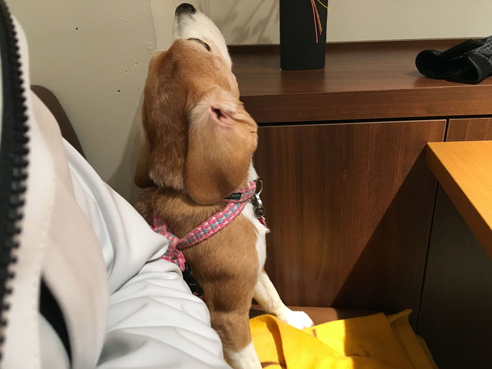 となりの席のワンちゃんとお互いが気になるので、毛布を敷いた上で逆側に来てもらいました。